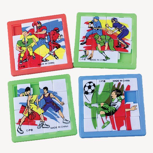 Test your problem solving skills with this slide puzzle. The 15 piece slide puzzle is decorated with assorted sporting scenes. Assorted colors. Size 2 1/4 sq. U.S. Toy Exclusive!"