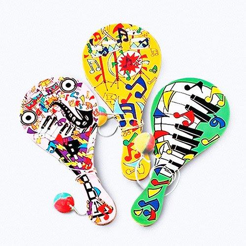Jazz up your party favor bag with this paddle ball. 3 assorted music oriented designs. Made of wood. Size 9 L. U.S. Toy Exclusive!"